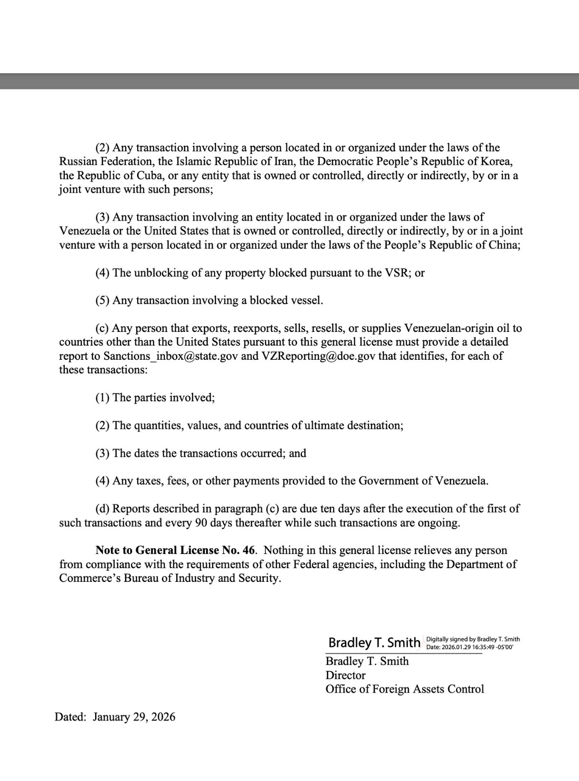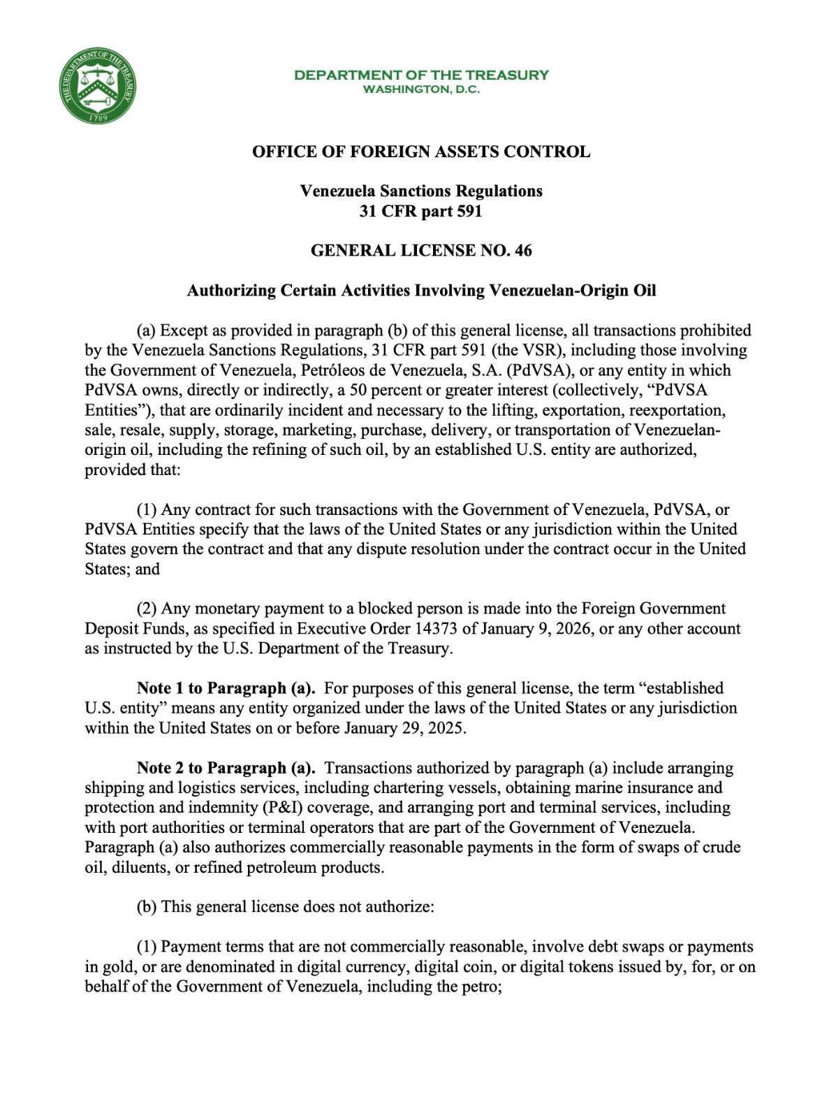 El Tesoro de Estados Unidos emitió una licencia general que autoriza las transacciones que involucran al gobierno de Venezuela y la petrolera estatal PDVSA que son «ordinariamente incidentales y necesarias para el levantamiento, exportación, reexportación, venta, reventa, suministro, almacenamiento, comercialización, compra, entrega o transporte de petróleo de origen venezolano, incluida la refinación de dicho petróleo, por una entidad estadounidense establecida».