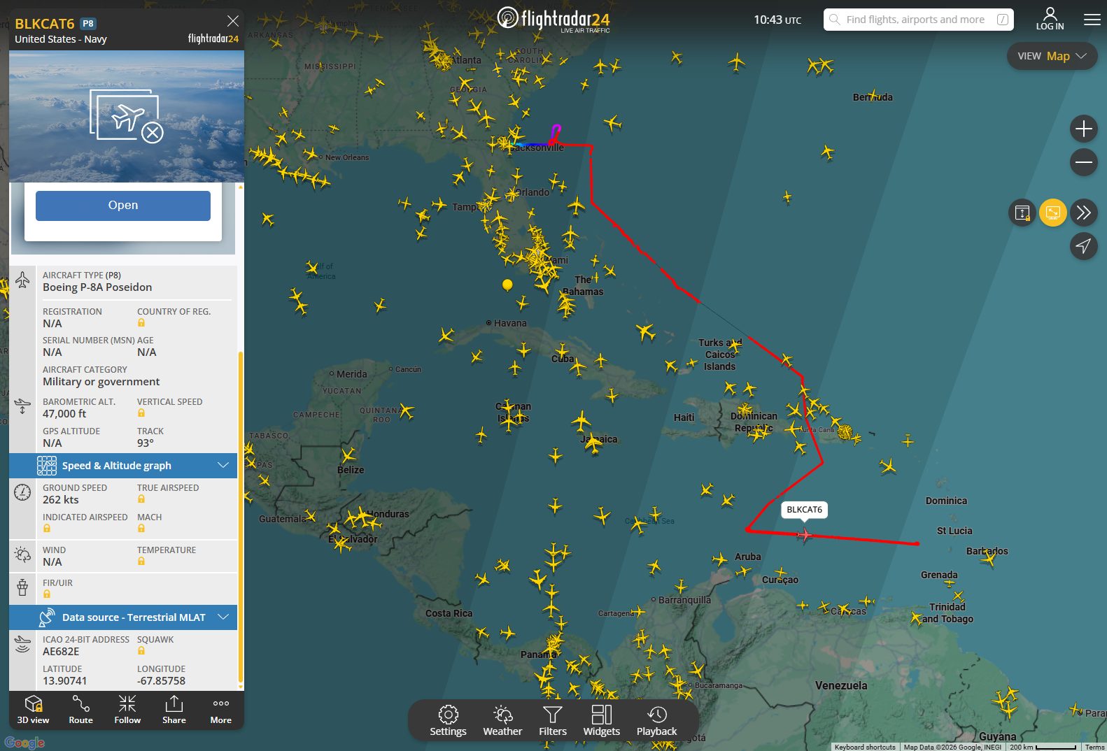 Según datos del monitor digital FlightRadar24, el misterioso aparato con toda probabilidad despegó desde la Base Aérea de Jacksonville, en Florida, Estados Unidos, y luego se dirigió hasta el mar Caribe, donde realizó varios giros de reconocimiento.