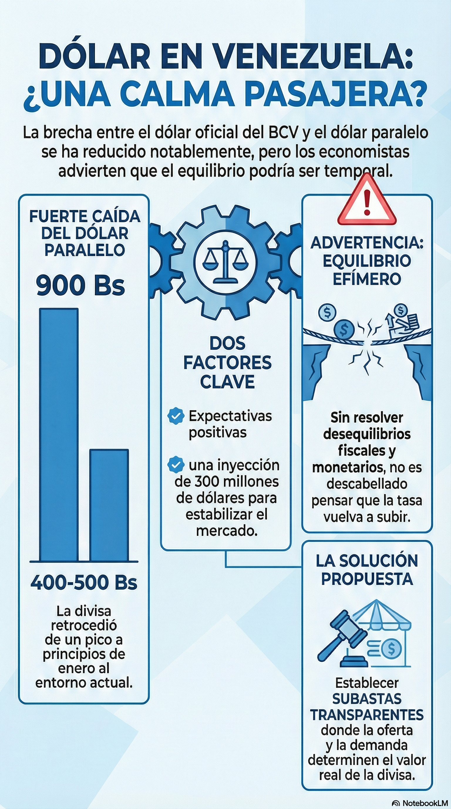 En declaraciones ofrecidas a la agencia EFE, el economista Asdrúbal Oliveros explicó que el mercado vivió una "sobrerreacción" tras los eventos políticos del 3 de enero. En aquel momento, la brecha rozó 99%, con un dólar paralelo en 900 bolívares frente a los 304 del BCV. Casi tres semanas después, la cotización informal oscila entre 400 y 500 bolívares, mientras que la tasa oficial cerró este jueves en 352,70 bolívares.