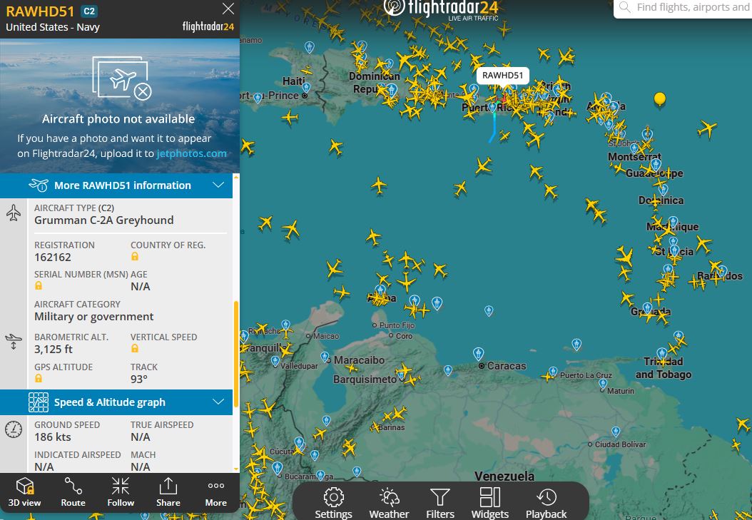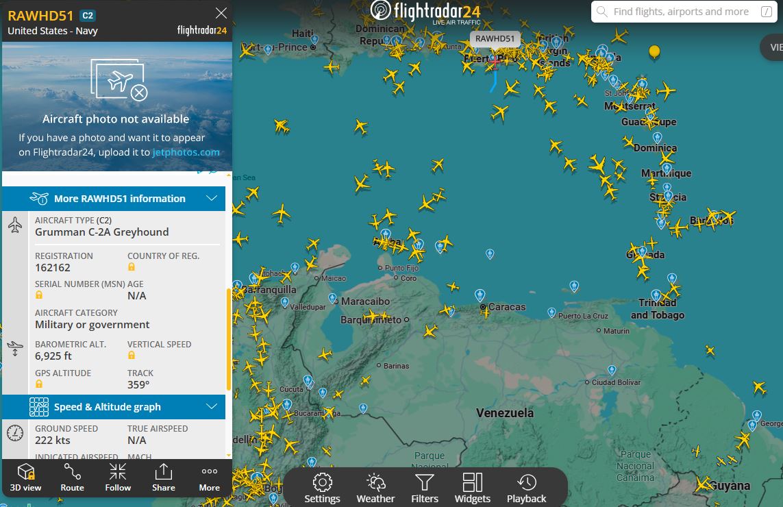 El Grumman C-2A Greyhound fue avistado la tarde del domingo 11 de enero en Flightradar24, realizando una misión logística clave desde el portaaviones USS Gerald R. Ford (CVN-78) hasta San Juan, Puerto Rico.