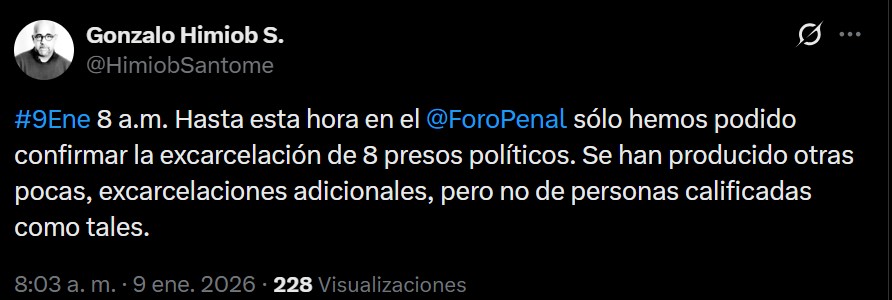El vicepresidente de la ONG Foro Penal, Gonzalo Himiob, informó la mañana de este viernes 9 de enero, que hasta ahora, solo se ha podido confirmar la excarcelación de ocho presos políticos en Venezuela.