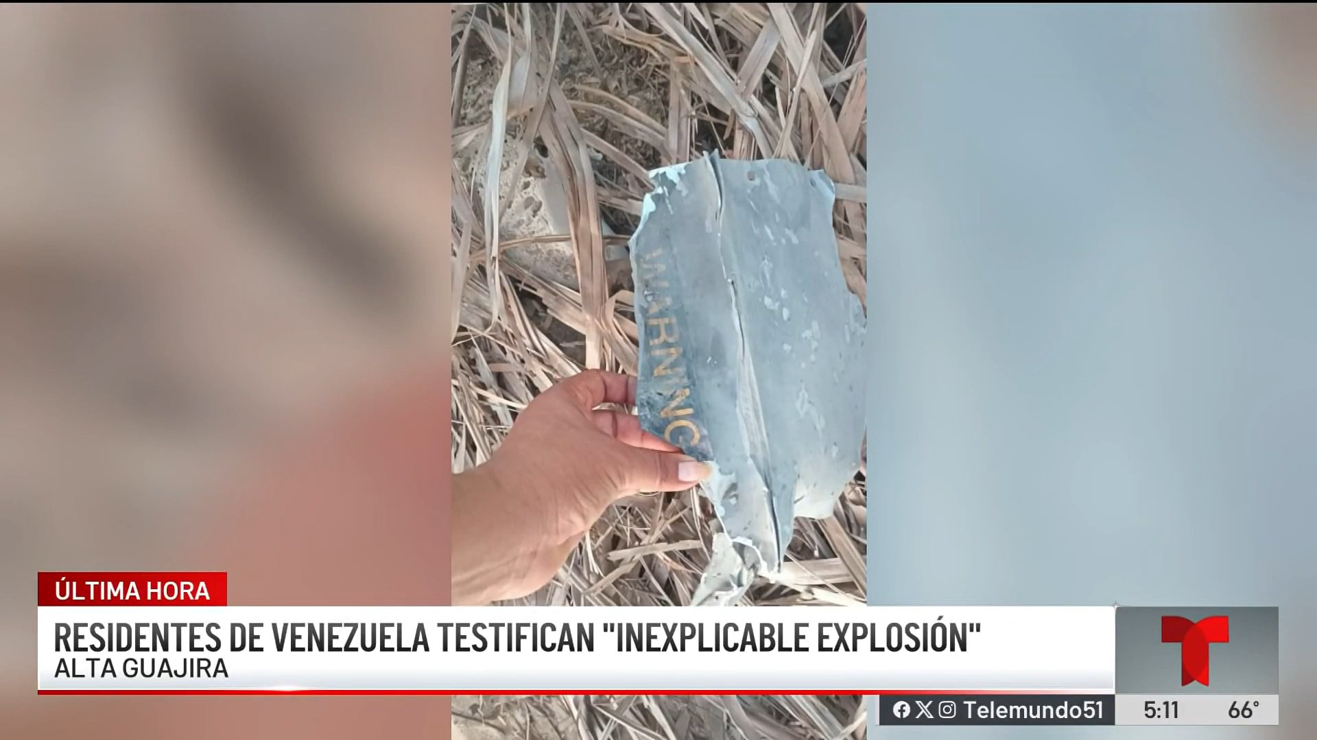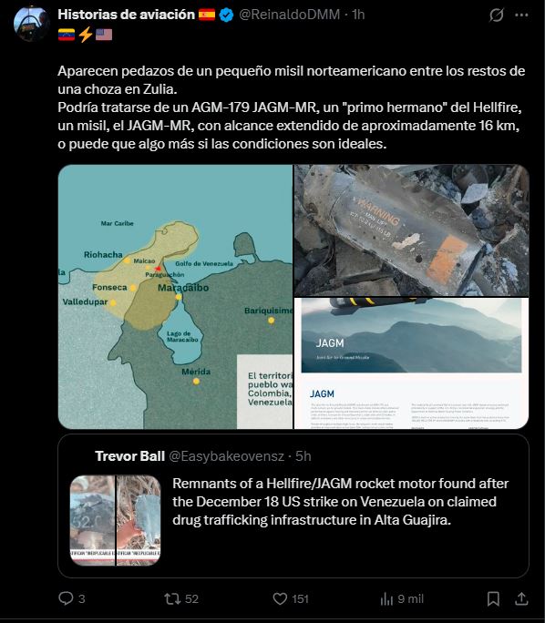 Imágenes exclusivas divulgadas por Telemundo revelaron fragmentos metálicos destruidos en la región de Alta Guajira, noroeste de Venezuela, cuyas características coinciden ampliamente con las de un misil AGM-114 Hellfire o su variante avanzada AGM-179 JAGM, usados por fuerzas estadounidenses.