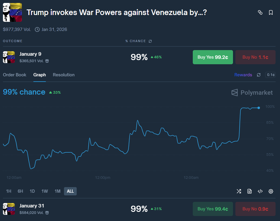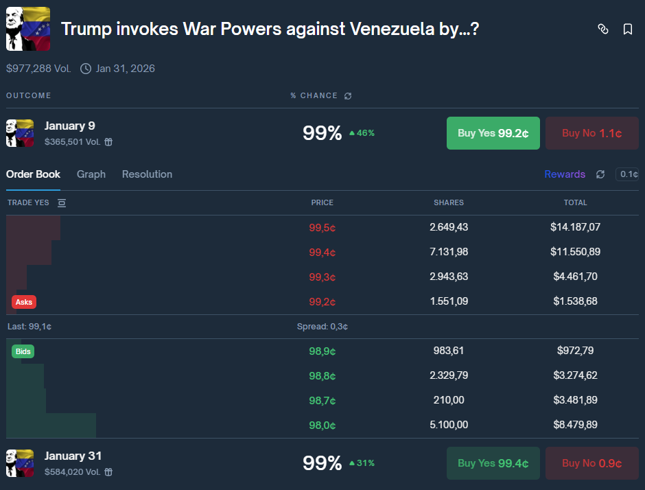 En la apuesta denominada «Trump invoca poderes de guerra contra Venezuela» la mayoría considera que esto sucederá antes del viernes 9 de enero o antes del sábado 31 del mismo mes.