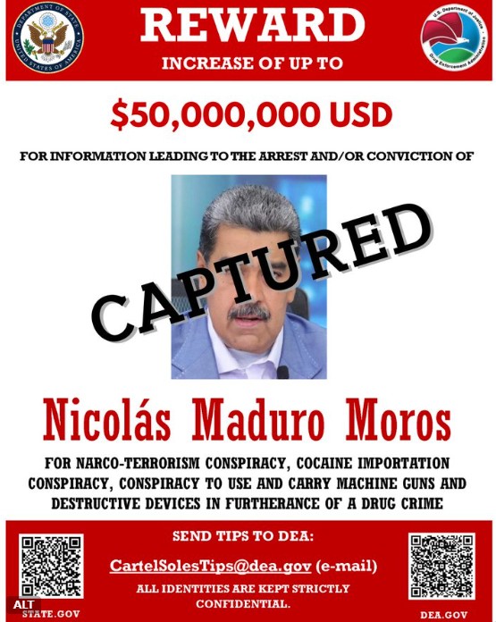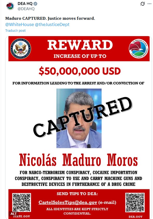 La DEA actualizó el estado de la recompensa de Nicolás Maduro Moros. Antes era se busca. Ahora es Capturado.