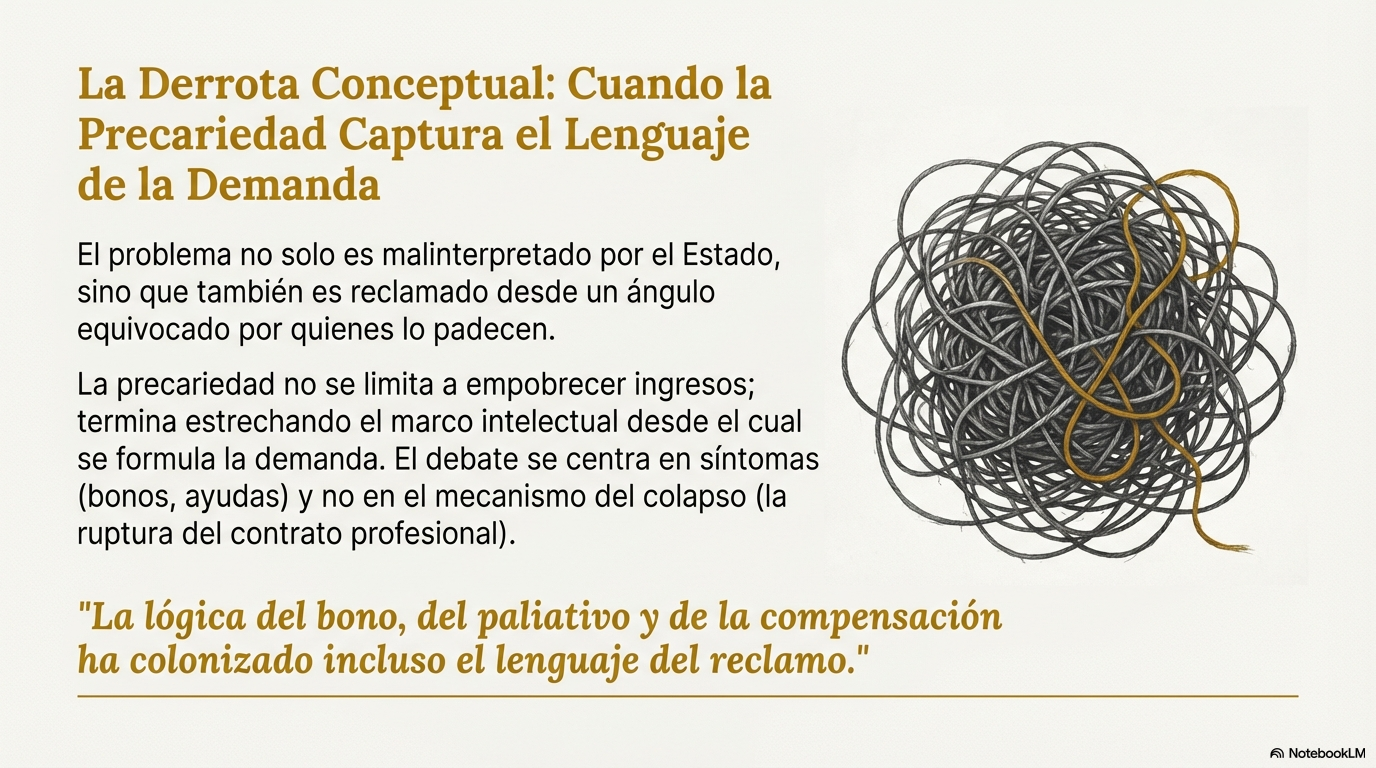 Aquí no se trata de humillación personal ni de miseria moral. Se trata de algo más preocupante: una derrota conceptual. La lógica del bono, del paliativo y de la compensación ha colonizado incluso el lenguaje del reclamo. El horizonte deja de ser la restitución de la profesión y pasa a ser la administración del daño.