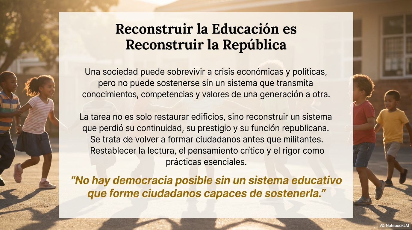 Después de un colapso tan profundo, Venezuela tiene que reconstruir la educación. No se trata de restaurar edificios ni de aumentar salarios, aunque ambas cosas son necesarias, sino de reconstruir un sistema que perdió su continuidad, su prestigio, su sentido de misión y su función republicana.