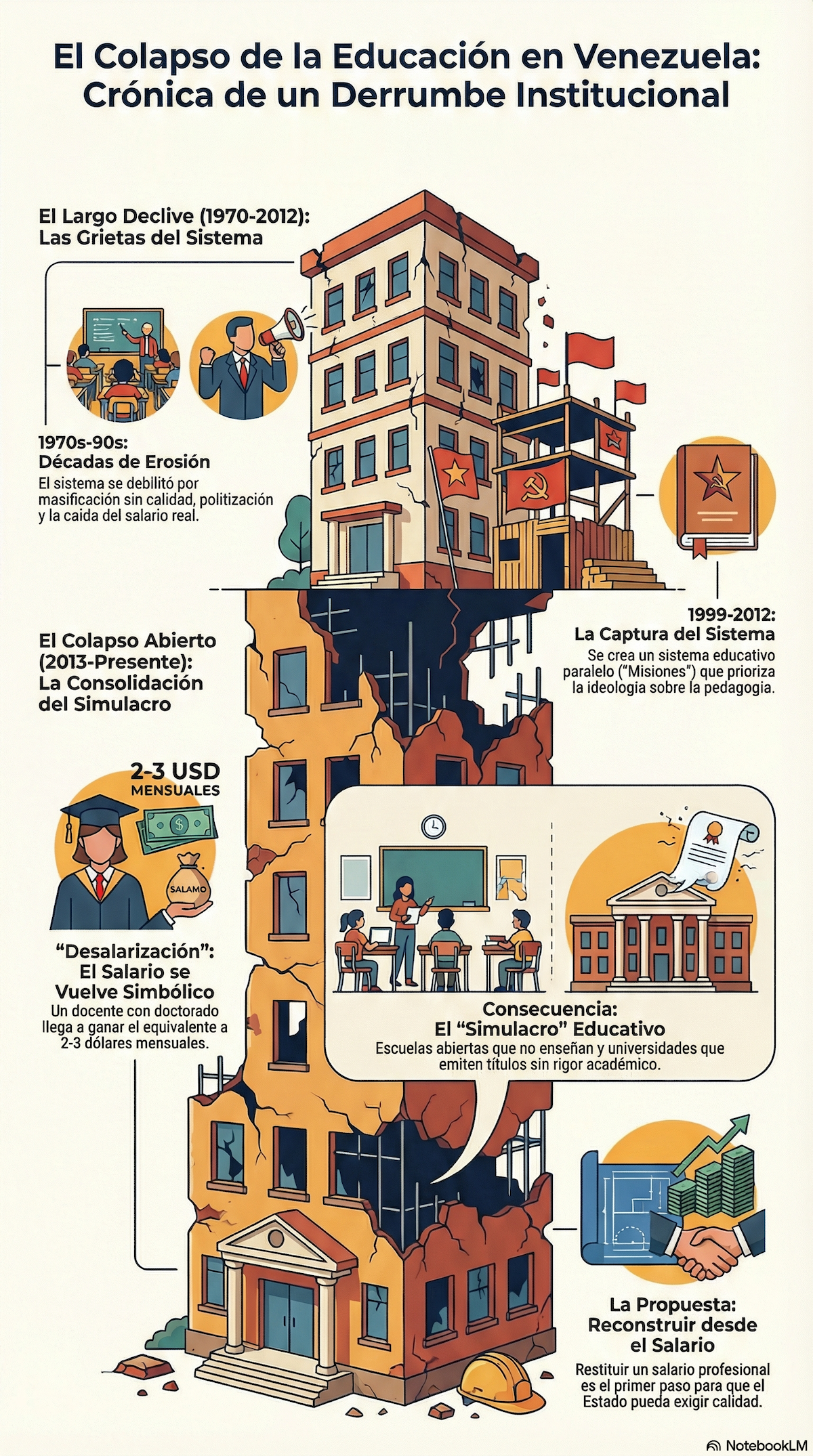 La desalarización es la cara más visible del derrumbe, pero no su origen. Es el resultado final de un proceso largo, acumulativo, que antecede al colapso político-económico del siglo XXI. La educación venezolana no se derrumbó de un día para otro. Llegó debilitada. Arrastraba fracturas institucionales, pérdida de interlocución política, deterioro material progresivo y una erosión lenta de su autoridad social.