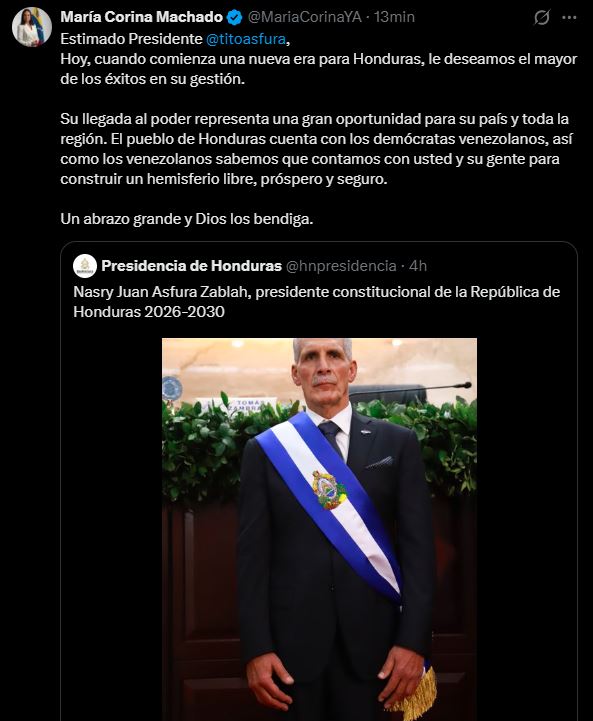 A través de su cuenta oficial en X, Machado expresó sus mejores deseos para la gestión de Asfura y subrayó la importancia de esta nueva etapa para Honduras y toda la región.