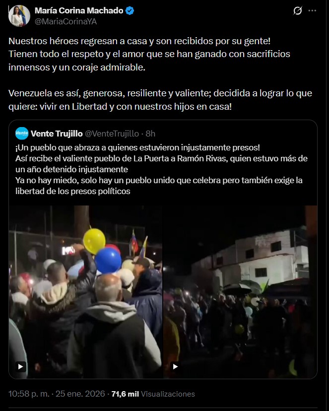 A través de su cuenta en X, Machado reaccionó a una publicación de Vente Trujillo, donde se mostraba la recepción que dio la comunidad de La Puerta a Ramón Rivas, quien pasó más de un año privado de libertad. En su mensaje, la dirigente opositora exaltó el sacrificio y el coraje de quienes estuvieron encarcelados por razones políticas.