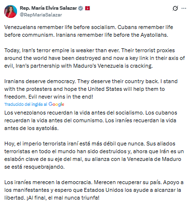 Para la representante de Florida, la caída de los grupos terroristas financiados por Teherán a nivel global está afectando la estabilidad de lo que denomina el «eje del mal», asegurando que la alianza entre Irán y el chavismo en Venezuela está sufriendo fracturas críticas.