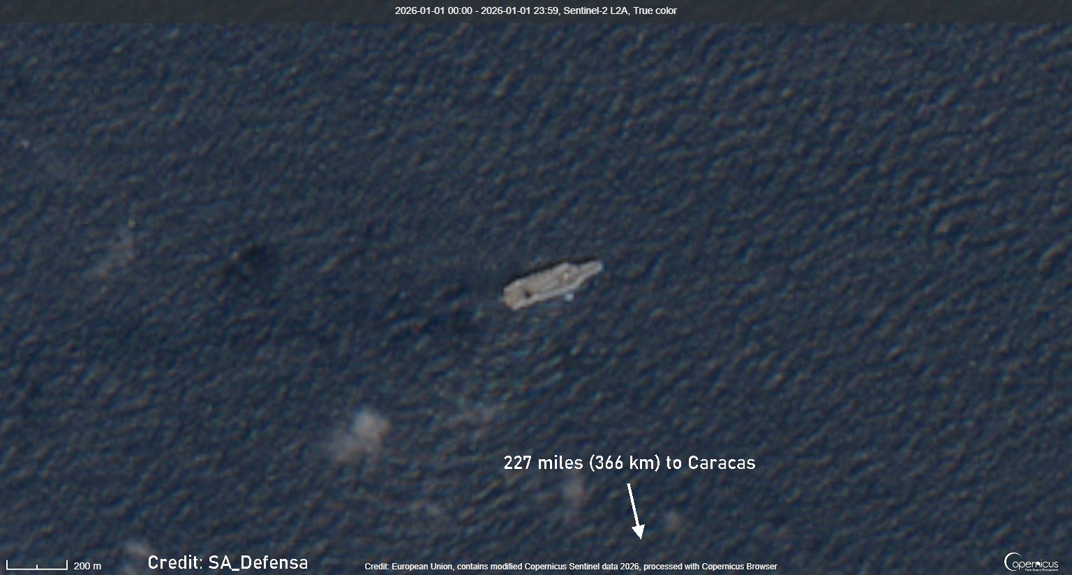 Una reciente captura del satélite europeo Sentinel-2, tomada el 1 de enero de 2026 en modo true color, reveló la posición del USS Gerald R. Ford (CVN-78), el portaaviones nuclear más grande y avanzado de la Marina de Estados Unidos, navegando en aguas del mar Caribe a aproximadamente 227 millas náuticas (366 km) al norte de Caracas, Venezuela.