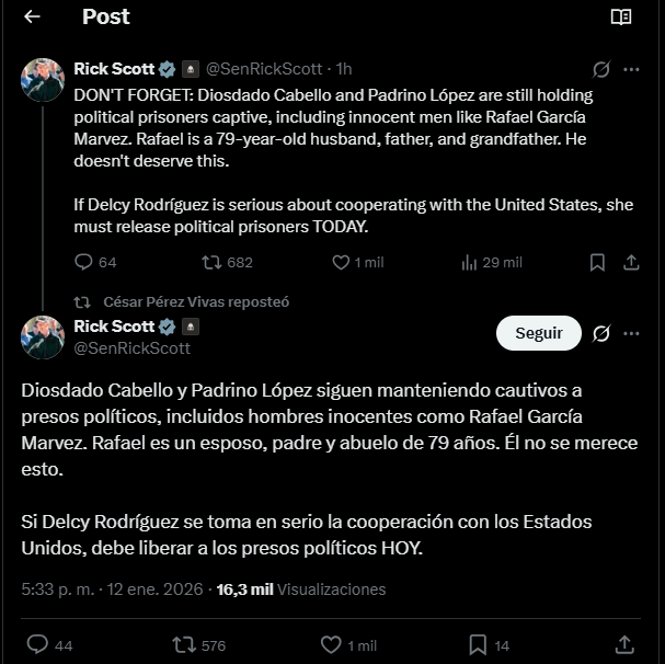 El senador republicano Rick Scott lanzó una dura advertencia el lunes 12 de enero, a través de su cuenta oficial en X (antes Twitter), exigiendo la liberación inmediata de todos los presos políticos en Venezuela, en respuesta a los persistentes retrasos del gobierno interino de facto de Delcy Rodríguez, para cumplir con lo prometido tras el anuncio del 8 de enero de Jorge Rodríguez sobre la excarcelación de detenidos por motivos políticos.