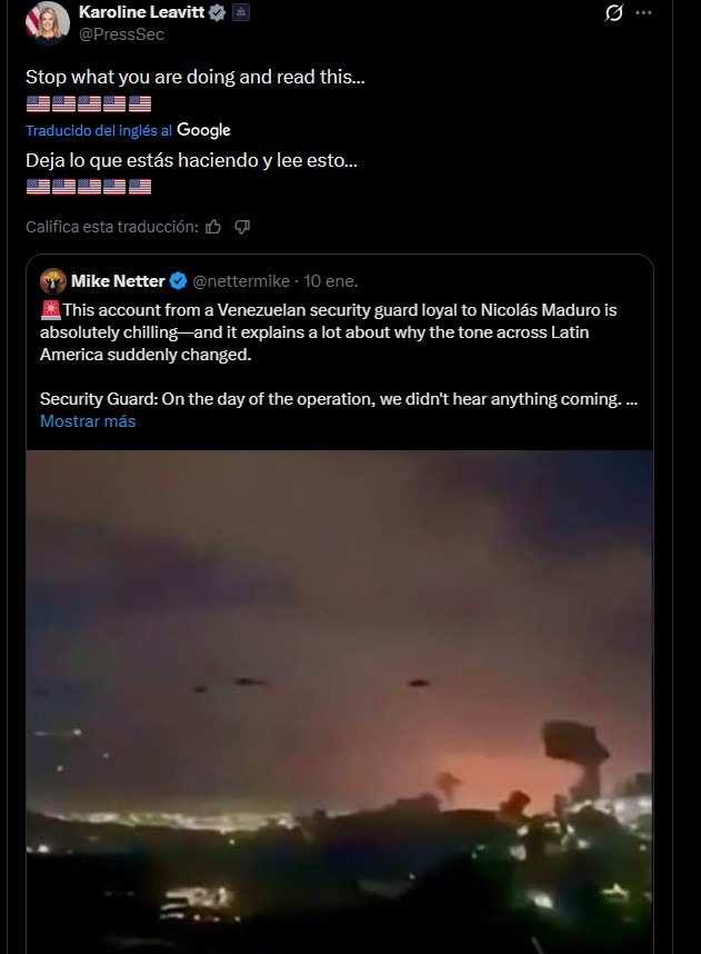 Según el texto citado de la secretaria de prensa de la Casa Blanca, Karoline Leavitt, en la red social X, el guardia de seguridad que estuvo en el lugar de la redada narró que estaba de guardia y “de repente todos los sistemas de radar se apagaron sin ninguna explicación”.