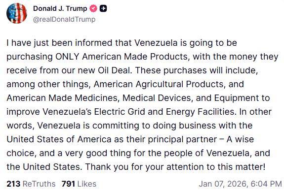El presidente Donald Trump anunció este miércoles 7 de enero. a través de su plataforma Truth Social, que los fondos generados por el reciente acuerdo petrolero tienen una condición de uso exclusiva: el chavismo se ha comprometido a adquirir únicamente bienes manufacturados en Estados Unidos.
