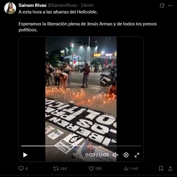 La activista y comunicadora Sairam Rivas informó desde su cuenta oficial de X, que se realizó una vigilia pacífica a las afueras de El Helicoide, principal centro de reclusión de presos políticos en Venezuela, en respaldo a la libertad del exconcejal de Caracas Jesús Armas y de todos los detenidos por motivos políticos.