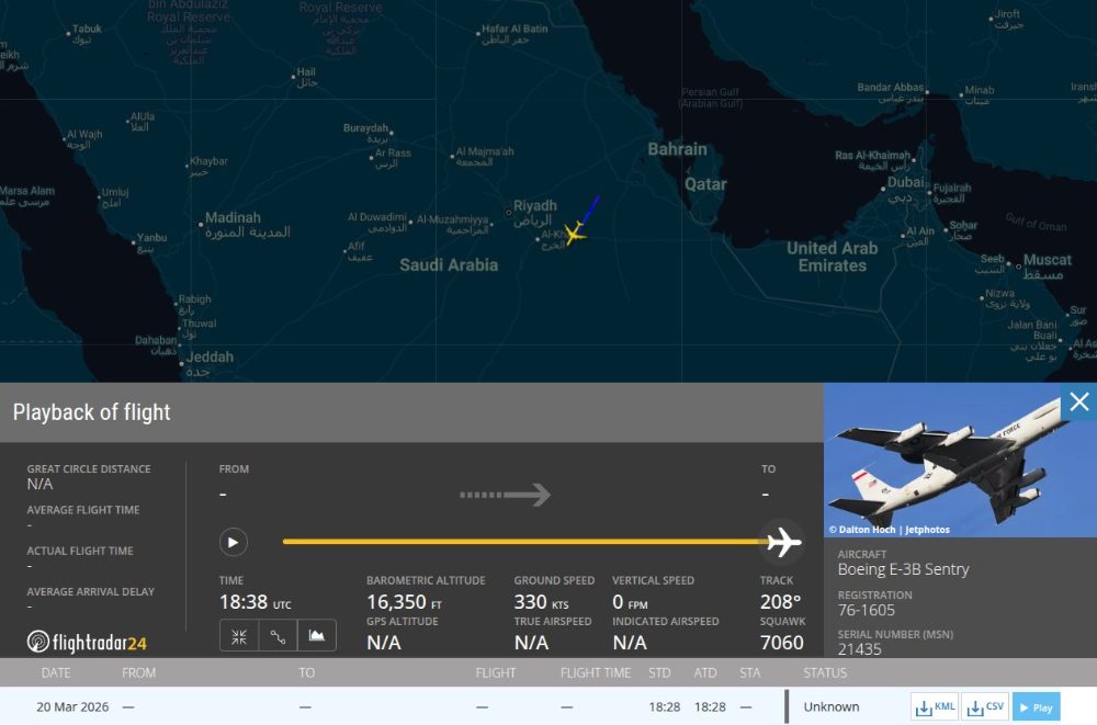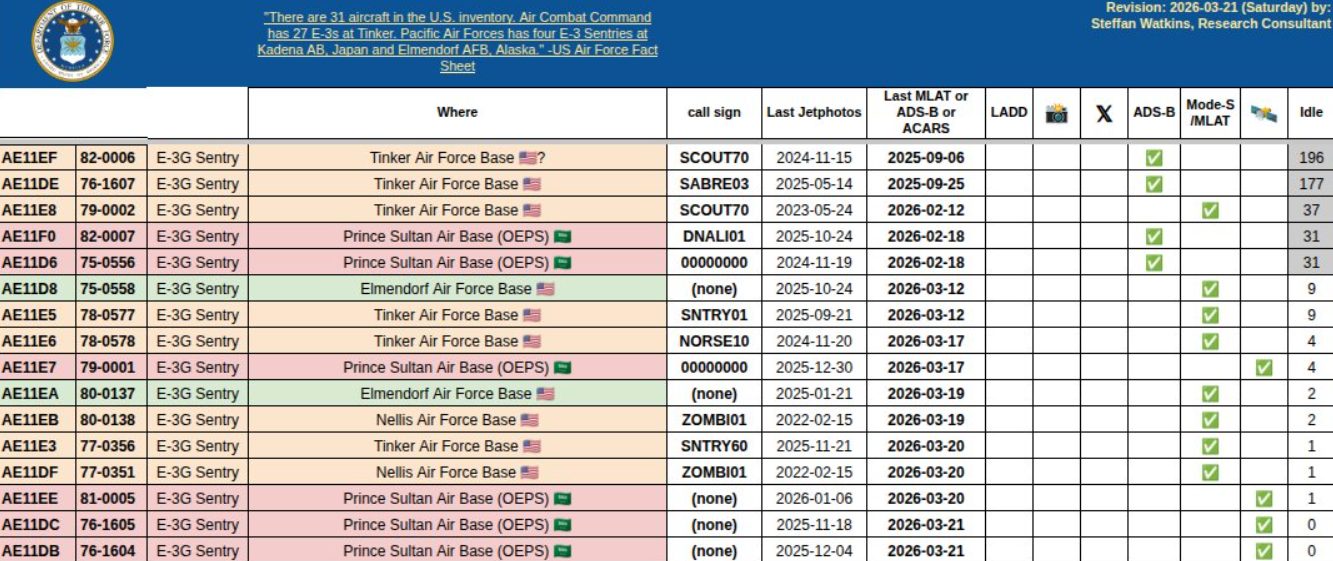 Los datos de seguimiento en FlightRadar24 y otras fuentes confirman que dicho E-3G Sentry fue incluido recientemente en la Operación Furia Épica y había realizado varios vuelos sobre Arabia Saudí.