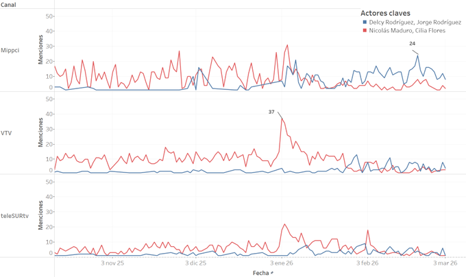 Los datos exponen un cambio de guardia mediático en el que, desde el 3 de enero y con mayor fuerza desde finales de ese mes, las menciones a Maduro y Flores han pasado a un segundo plano. En contraste, la frecuencia de las menciones a Delcy Rodríguez, y al jefe de la Asamblea Nacional, Jorge Rodríguez, muestra un crecimiento sostenido en las plataformas del régimen.