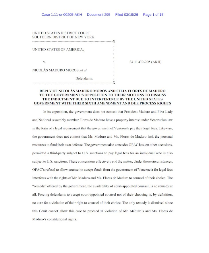 -“La ley venezolana otorga al Sr. Maduro y a la Sra. Flores de Maduro un derecho de propiedad sobre el pago de sus honorarios legales. La revocación de las Licencias Originales por parte de la OFAC y la negativa a restablecerlas interfiere con su derecho a contratar al abogado de su elección ya que, sin la capacidad de ejercer este derecho de propiedad, ninguno de los dos tiene la capacidad de financiar la defensa por sí mismos. Ver Declaración. de Nicolás Maduro Moros (ECF No. 290-2) y Declaración. de Cilia Flores de Maduro (ECF No. 293-2) (declaraciones juradas de incapacidad de pago y disposición a presentar declaraciones financieras a petición de la Corte)”, afirma Pollack en la foja 4 de su presentación.