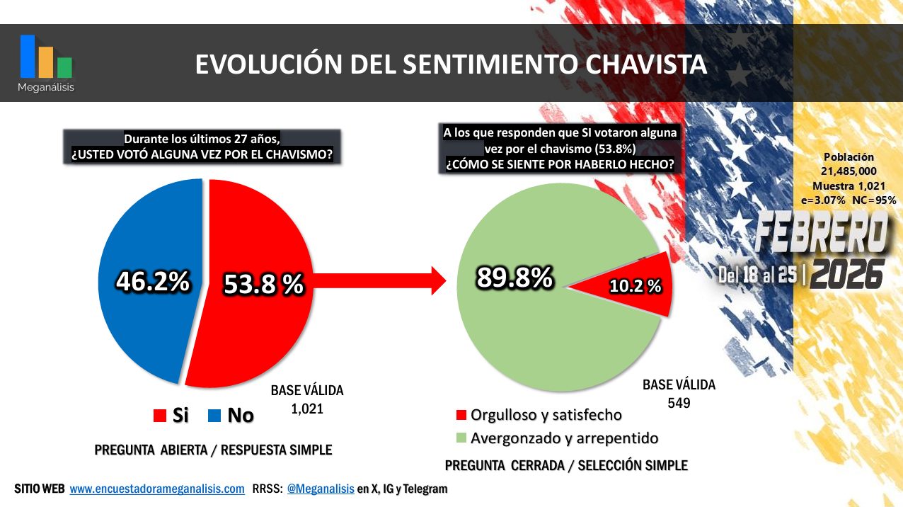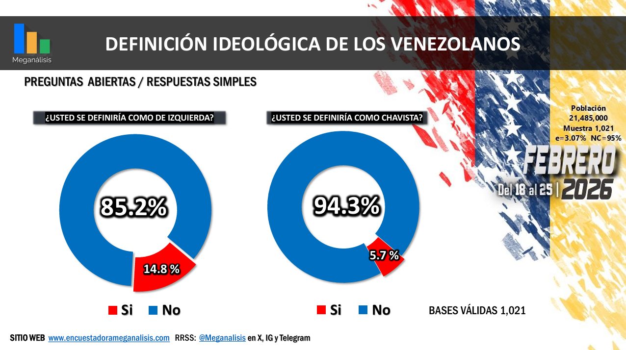 La gran mayoría de los venezolanos (85,2%) no se define como izquierdista y un abrumador porcentaje (94,3%) no se define como chavista. En contraste, 53,8% de los consultados reconocen que votaron alguna vez por el chavismo. Entre ellos, la mayoría (89,8%) se siente avergonzada y arrepentida de haberlo hecho.