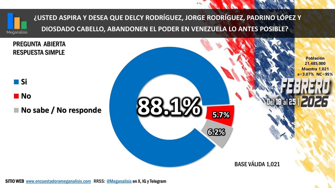 Por si fuera poco, el 90,1% no está de acuerdo con que Rodríguez administre la transición desde el Palacio de Miraflores y un 88,1% desea su salida inmediata junto a su hermano, Jorge Rodríguez, el general en jefe chavista, Vladimir Padrino López, y el cuestionado Diosdado Cabello.