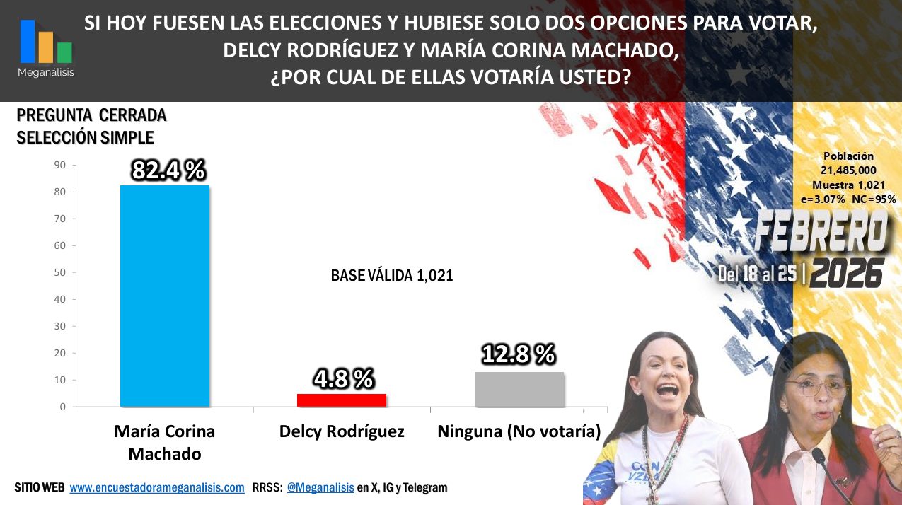 En una elección cerrada, solo con Machado y Rodríguez como candidatas, el respaldo de la dirigente de Vente Venezuela (VV) subiría hasta 82,4%, mientras que la encargada chavista contaría únicamente con 4,8%.