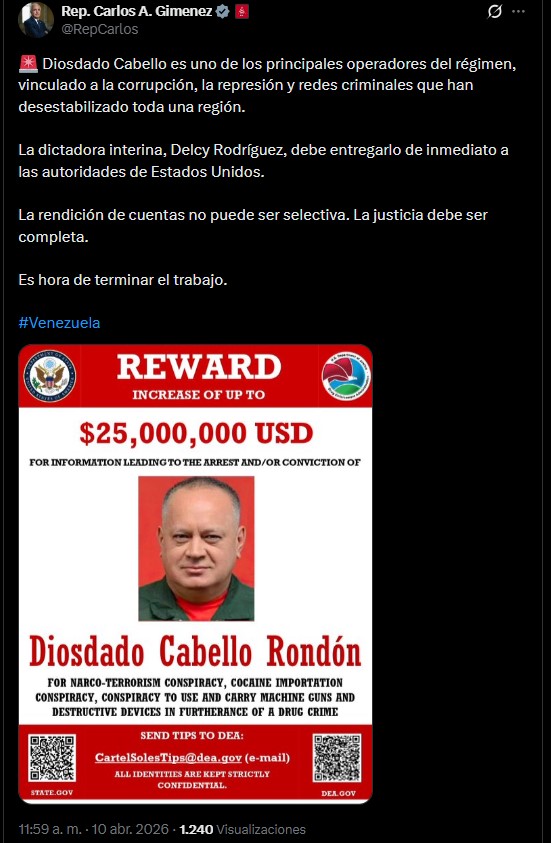 La publicación estuvo acompañada por una imagen en la que se observa la recompensa de 25 millones de dólares ofrecida por Estados Unidos por información que conduzca a la captura de Cabello, una cifra que el legislador utilizó como marco para insistir en la necesidad de avanzar en la rendición de cuentas.