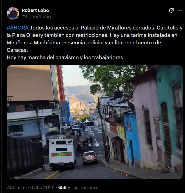 La mañana de este jueves 9 de abril amaneció con todos los accesos al Palacio de Miraflores cerrados, en medio de la jornada de protestas convocada por trabajadores y estudiantes universitarios, así como de la contramarcha anunciada por el chavismo.