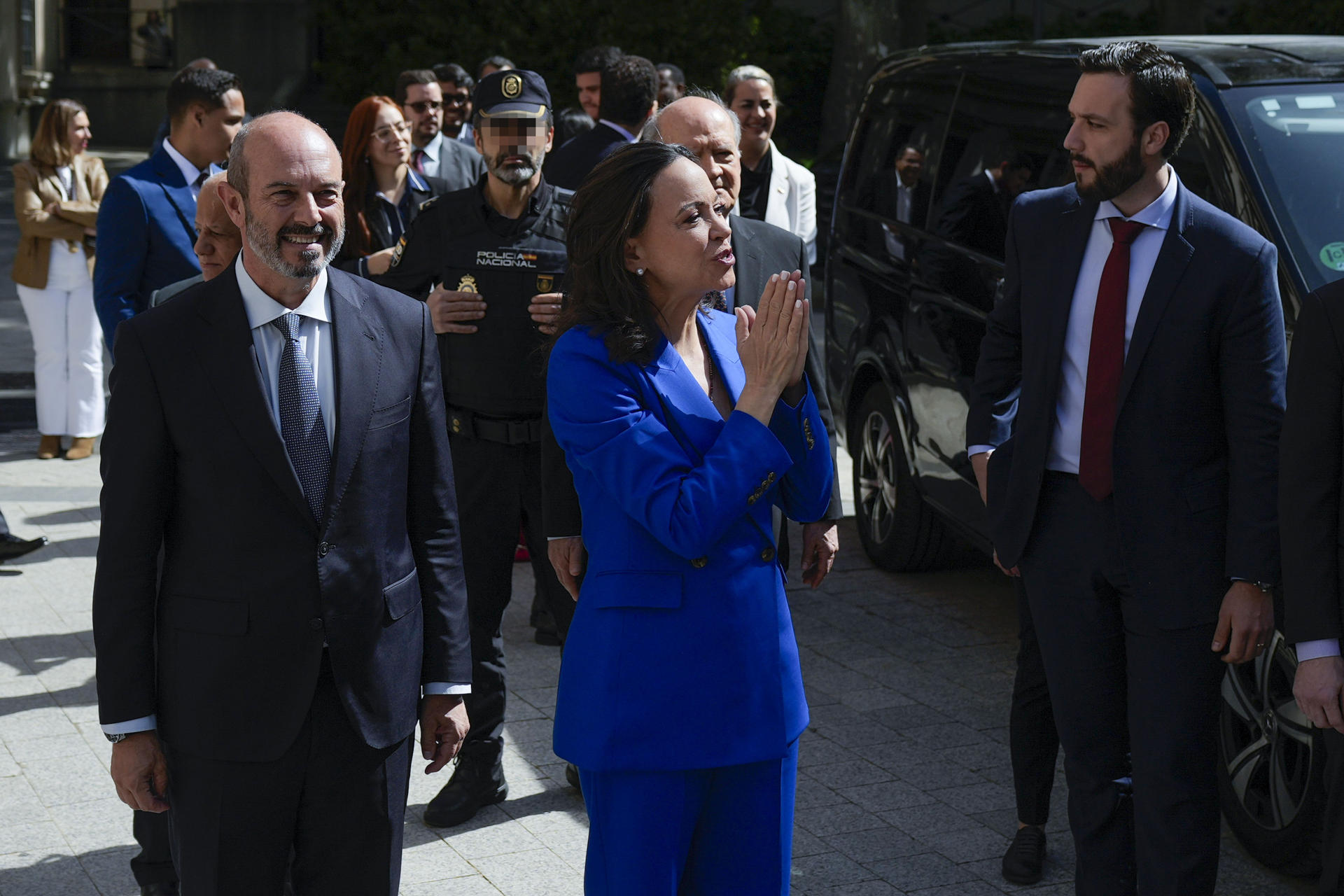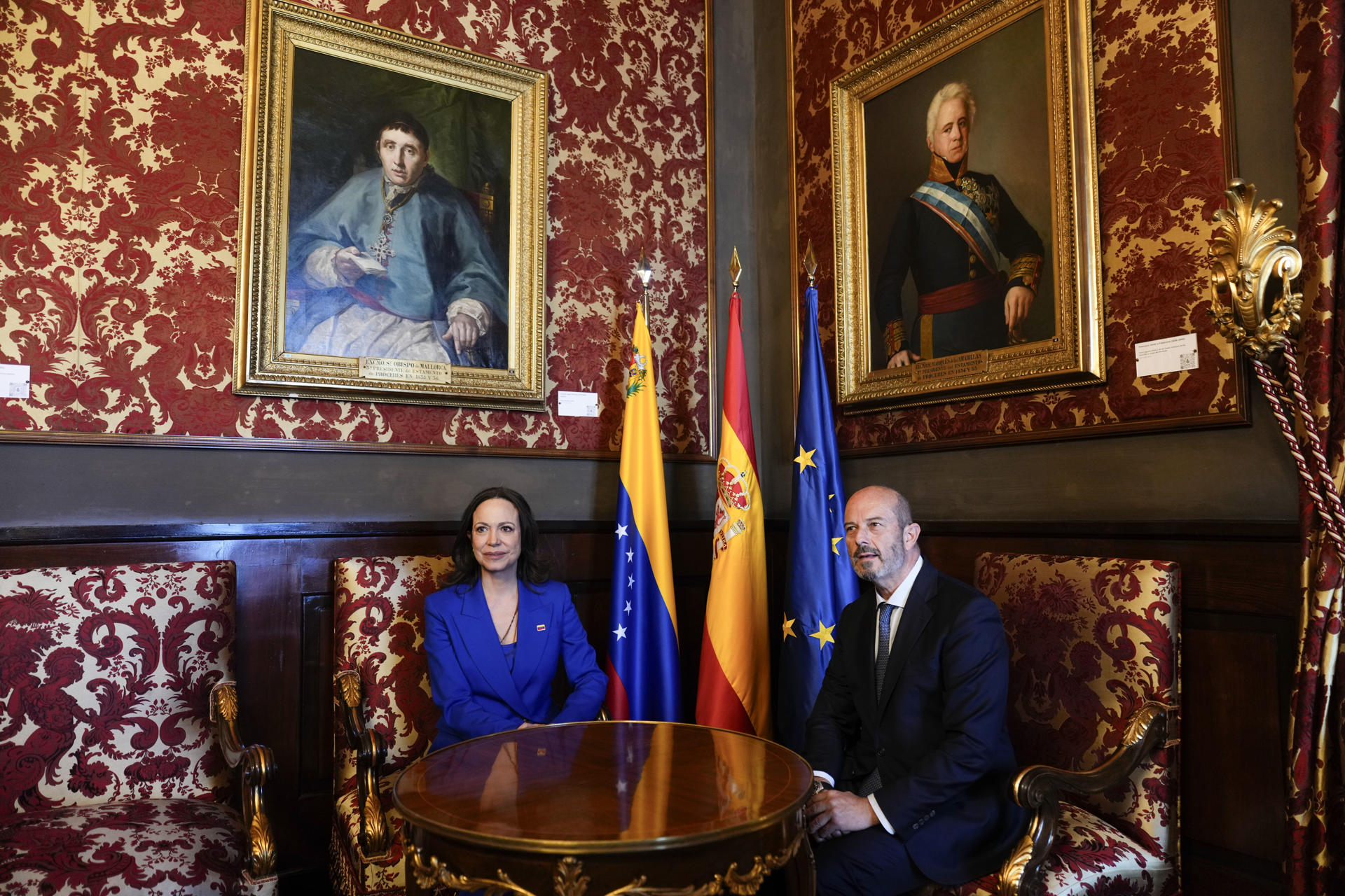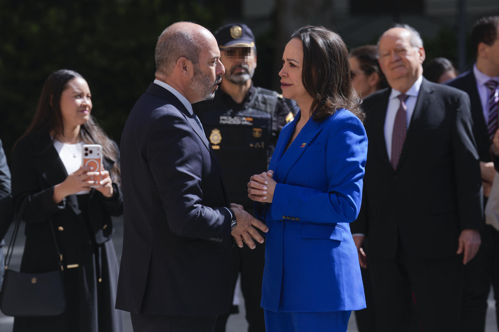 El presidente del Senado español, Pedro Rollán, ha recibido hoy, 20 de abril, a la líder opositora de Venezuela y Premio Nobel de la Paz 2025, María Corina Machado, en la Plaza de la Marina Española.