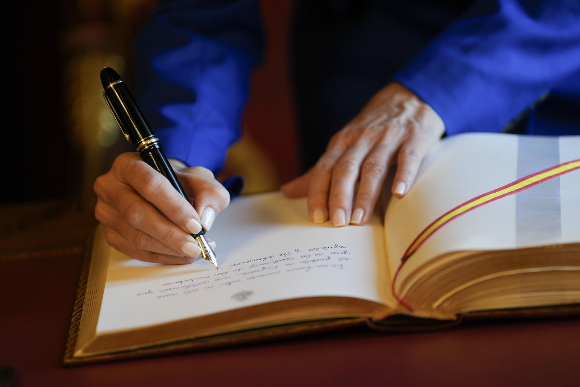 La líder opositora venezolana y Nobel de la Paz María Corina Machado firma en el libro de honor durante su visita al Senado en Madrid. EFE/ Borja Sanchez-Trillo