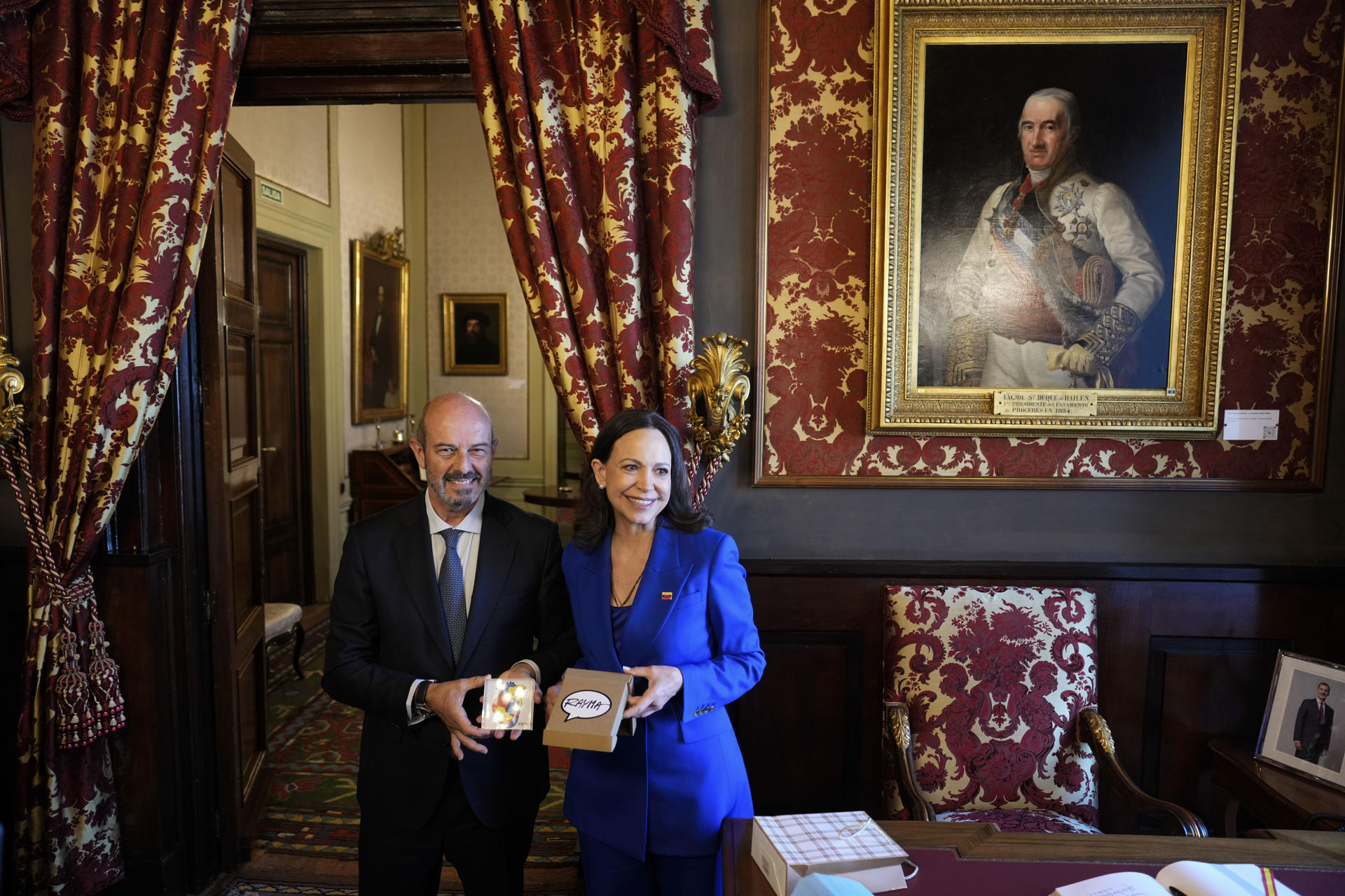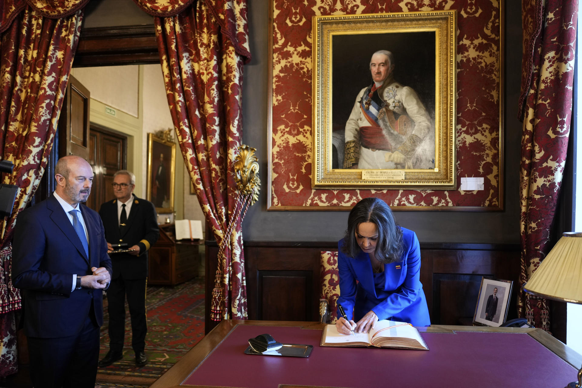 La líder opositora venezolana y Nobel de la Paz María Corina Machado (d) firma en el libro de honor junto al presidente del Senado, Pedro Rollán (i) durante su visita al Senado en Madrid. EFE/ Borja Sanchez-Trillo