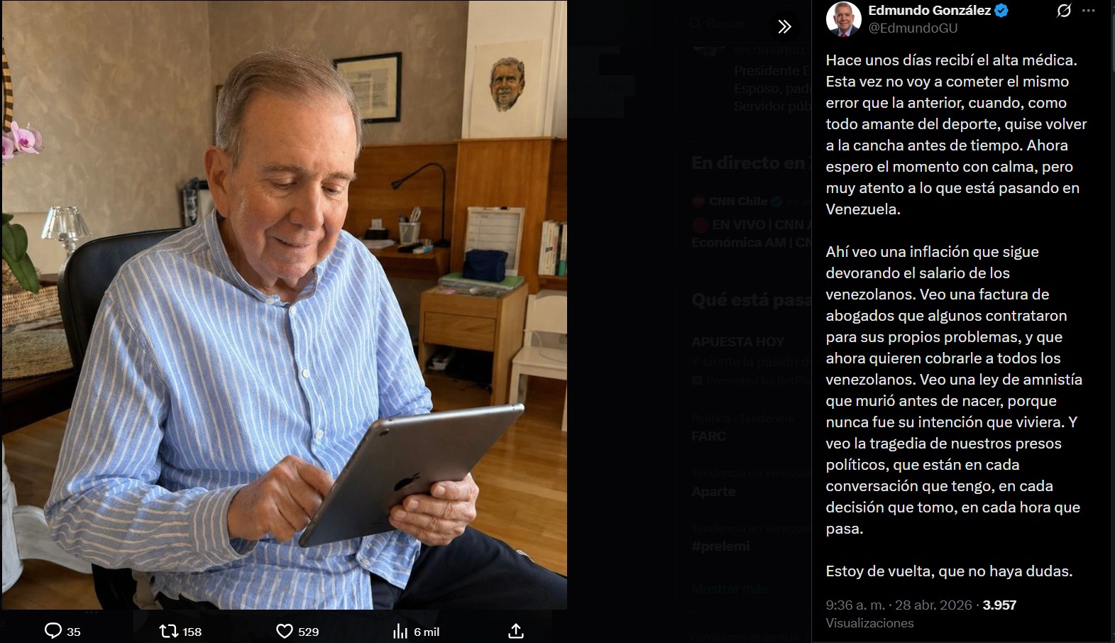El líder opositor venezolano Edmundo González Urrutia reapareció este martes con un mensaje publicado en su cuenta de X, luego de haber recibido recientemente el alta médica tras sus problemas de salud en España.