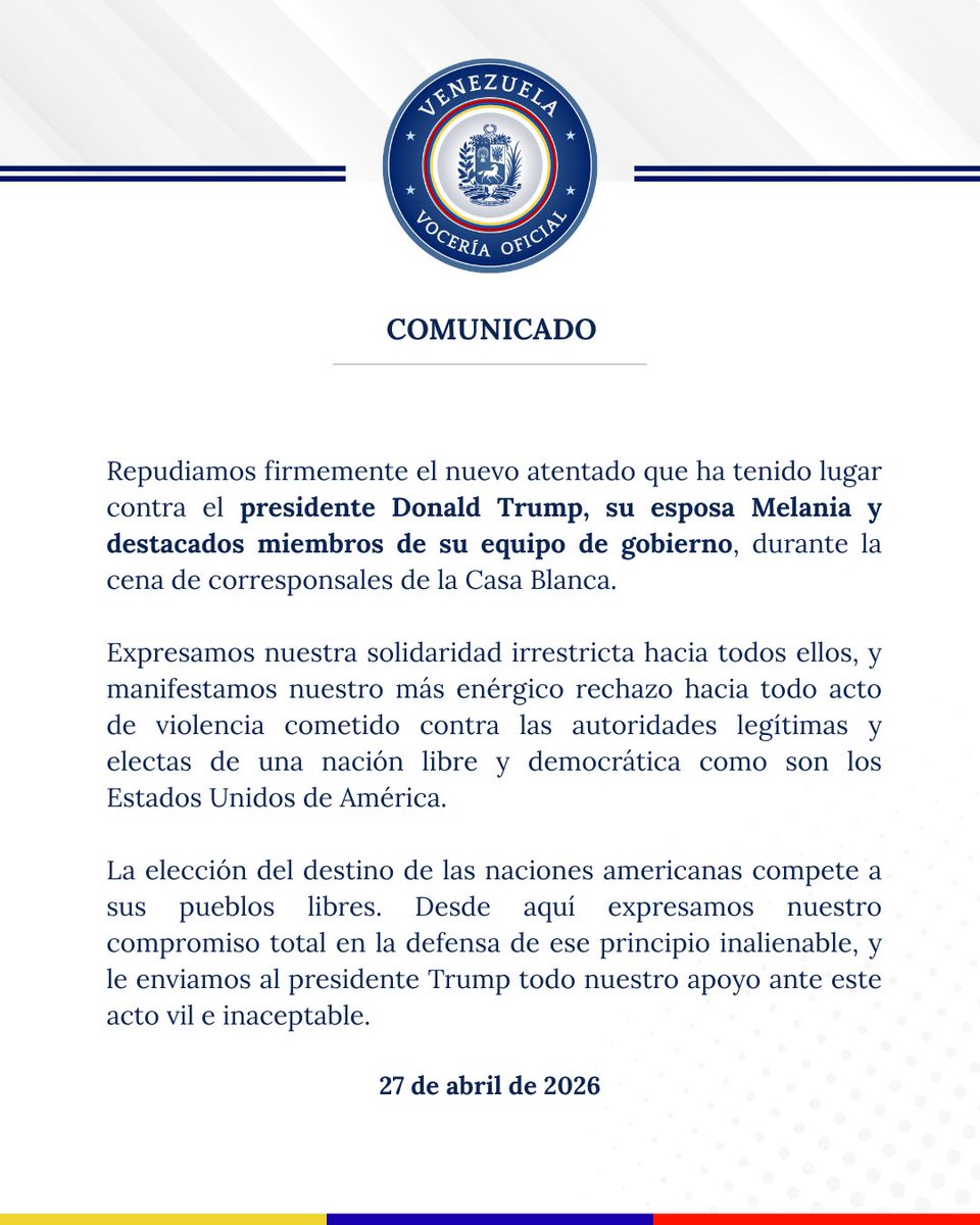 La vocería oficial del líder opositor, Edmundo González y la Premio Nobel de la Paz, María Corina Machado, expresó este lunes su rechazo al atentado ocurrido contra el presidente de Estados Unidos, Donald Trump, durante la cena de corresponsales de la Casa Blanca en Washington.