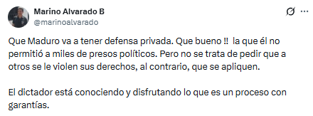 El defensor de derechos humanos, Marino Alvarado, se pronunció a través de su cuenta en X para destacar la diferencia de lo que ocurre en medio del caso de la acusación contra Nicolás Maduro en EEUU.