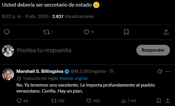 «No. Ya tenemos uno excelente. Le importa profundamente el pueblo venezolano. Confía. Hay un plan», enfatizó Billingslea en respuesta a la incertidumbre de muchos ciudadanos que esperan un pronto retorno de la democracia.
