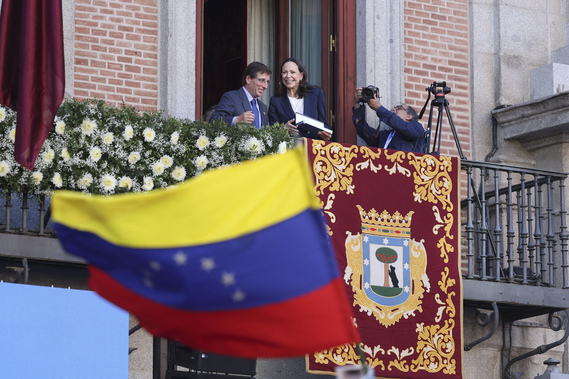 Tras recibir las llaves de la capital española, Machado salió al balcón de la Casa de la Villa y saludó a miles de venezolanos que se acercaron para darle la bienvenida.